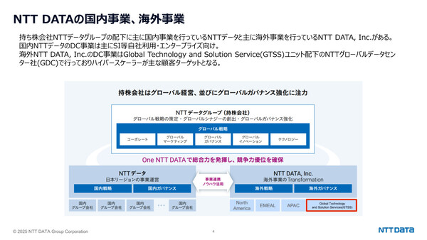 NTTデータグループ(持株会社)は、国内事業を展開するNTTデータと海外事業を展開するNTT DATA, Inc.を配下に持ち、データセンター事業もそれぞれの会社が展開している。