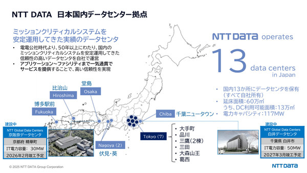 日本のNTTデータは現在、国内に11拠点のデータセンターを保有しており、SIなどでの自社利用、エンタープライズ向けサービスなどを中心に事業展開している。合計の延床面積は60万平方メートル、データセンター利用可能面積は13万平方メートル、電力キャパシティは117MW。加えて、2026年2月には京阪奈データセンター(30MW)、2027年3月には白井データセンター(50MW)を竣工予定だ。