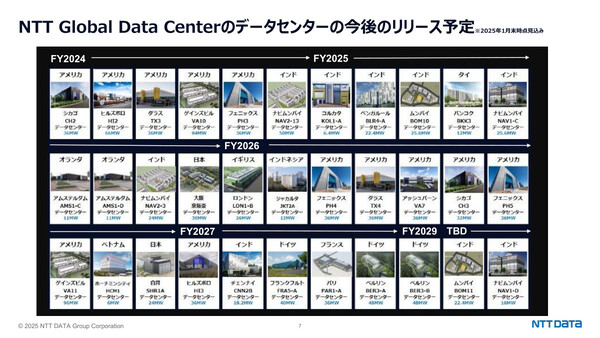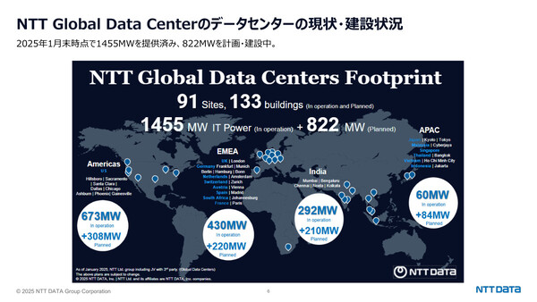 一方で海外では、NTT DATA, Inc.配下のNTTグローバルデータセンター(NTT GDC)を通じて、ハイパースケーラー向けを中心としたデータセンター事業を推進している。 NTT GDCは米国、EMEA、インド、APACの各地に91拠点のデータセンターを展開しており、合計のIT電力容量は1455MWに達する(2025年1月時点)。これに加えて33拠点、822MWのデータセンター開設を計画しており、大規模な電力容量が確保できる用地の取得にも力を注いでいるという。