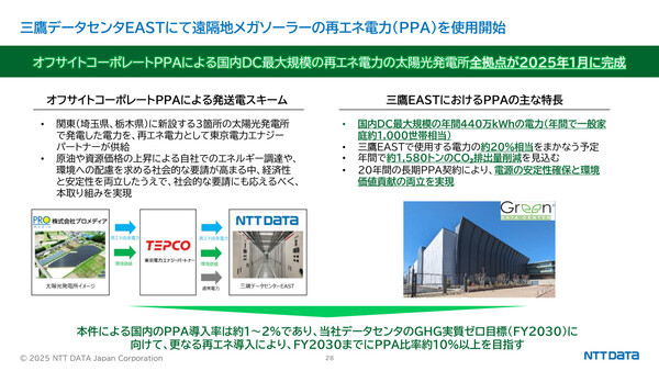 そのために、同社の旗艦データセンターである「三鷹データセンターEAST」において、遠隔地メガソーラーの再エネ電力(PPA)の使用を開始した。国内データセンターでは最大規模という「年間440万kwh」(一般家庭およそ1000世帯分)をPPAで対応する。この電力量は、同データセンター全体ではおよそ20%をカバーできるものだという。さらに2030年度までには、グループ全体のPPA比率を10%までに高める計画だ。