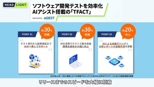 先端品質テクノロジーを活用してソフトウェアの品質・安全性向上を支援する株式会社AGEST(本社: 東京都文京区、代表取締役 社長執行役員 CEO: 二宮 康真、以下、「AGEST」)は、タクシー内で放映中の移動時間の情報番組「HEADLIGHT」にて、AIテスト管理ツール「TFACT」のPRコンテンツの配信を本日より開始することをお知らせいたします。