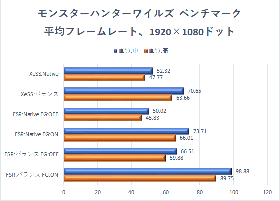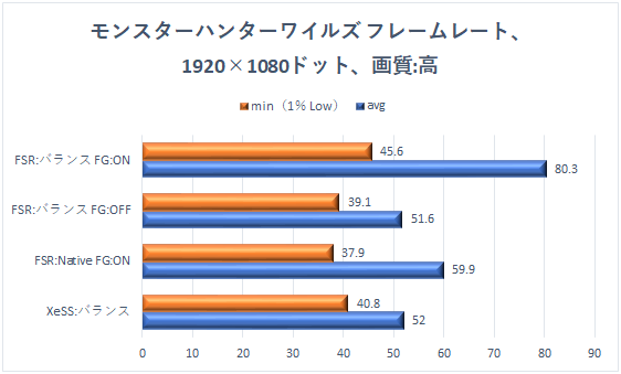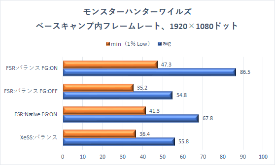 ベンチマークでは高設定でも健闘していた「XeSS:バランス」だが、残念ながら平均値が60fpsを下回ってしまい、60fps超えはフレーム生成を効かせた「FSR:Native FG:ON」と「FSR:バランス FG:ON」になっている。 大きなカクつきは感じなかったが、ゲームのスムーズなプレイに影響するmin(1% Low)が各設定において30fpsこそ超えているものの60fpsには届かず、モンハンワイルズのGPU負荷の高さを改めて感じさせる結果であった。
