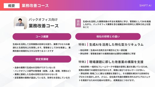 「日本をAI先進国に」を掲げAIのビジネス活用を学べるAI大学「SHIFT AI」を運営する株式会社SHIFT AI(東京都渋谷区、代表取締役 木内翔大、以下 当社 )は、DX(デジタルトランスフォーメーション)推進に必要な法人向け新サービス「業務改善コース」を2025年3月10日より提供開始します。本コースは、業務の生産性向上を目的とし、生成AIを活用して定型業務を効率化するための実践的なスキルを習得を支援するプログラムです。