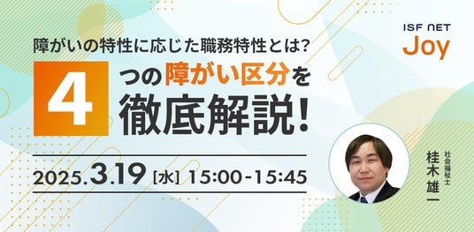 株式会社アイエスエフネットジョイ(本社:東京都中野区、代表取締役:渡邉幸義、以下アイエスエフネットジョイ)は、2025年3月19日(水)の日程にて障がい者雇用ミニセミナー「障がいの特性に応じた職務適正とは?4つの障がい区分を徹底解説!」を開催いたします。
