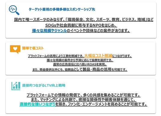 新プラットフォームでは、プロジェクトの魅力をより効果的に伝えるため、認知度や共感を拡散させるための伝えるための機能を充実させました。また、“長期的で良好なパートナーシップの実現“の架け橋になるという想いから、より円滑かつ、質の高いマッチングを実現するための機能面を強化し、それによりスポンサーとスポンシーとのマッチング精度の向上、企業や自治体、NPO、イベント団体など様々なユーザーが利用しやすくなっております。