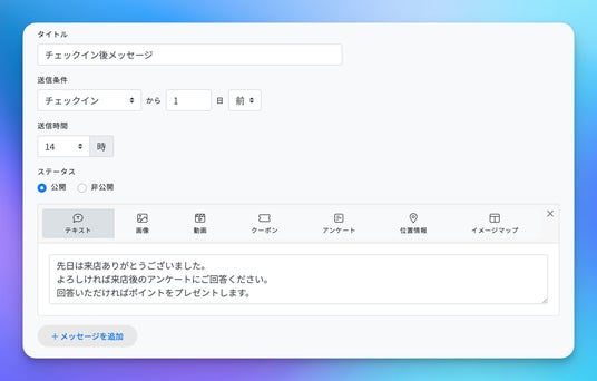 「チェックインから○○日後の○○時」という形で、任意のタイミングでメッセージ配信が設定できるため、業種や目的に合わせた最適なフォローアップが可能です。