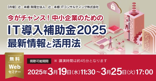 辻・本郷 税理士法人(本社:東京都新宿区、理事長:桑木小恵子)と共催で、2025年3月19日(水)に無料セミナー『今がチャンス! 中小企業のためのIT導入補助金2025最新情報と活用法』を開催いたします。