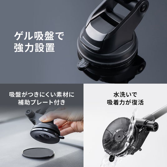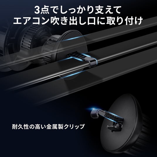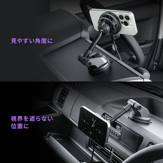 ボールジョイント機構を採用し、360度回転や角度調整が可能。運転席や助手席の位置に合わせて、最適な角度に設定できます。取り付け方法は、エアコン吹き出し口に固定できるタイプ(200-CAR115)とダッシュボードに設置できる吸盤取り付けタイプ(200-CAR116)の2種類からお選びいただけます。視界を遮ることなく快適なドライブ環境を整えましょう。