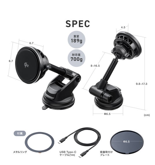 車載ホルダー Qi2正規認証 最大15W充電 ペルチェ素子 冷却 MagSafe 吸盤取り付け スマホホルダー ワイヤレス充電器 車 360度調整 片手操作 磁気吸着 メタルリング付属