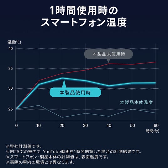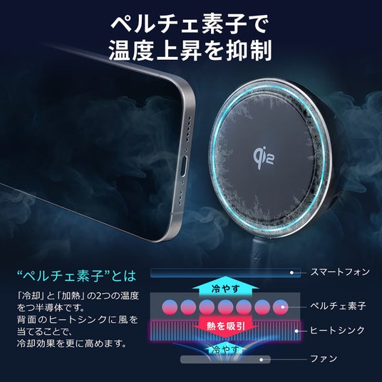 充電中の発熱が気になる方に朗報!本製品はペルチェ素子とヒートシンクを搭載し、発熱を効果的に抑制。充電時の温度上昇を抑え、スマートフォンのバッテリー寿命を守ります。特に夏場の長時間運転でも安定した充電が可能で、安心して使用できます。
