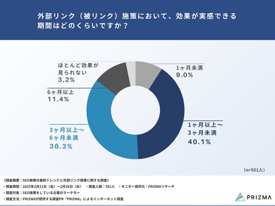 「外部リンク(被リンク)施策において、効果が実感できる期間はどのくらいですか?」と質問したところ、『1ヶ月以上~3ヶ月未満(40.1%)』と回答した方が最も多く、『3ヶ月以上~6ヶ月未満(36.3%)』『6ヶ月以上(11.4%)』と続きました。
