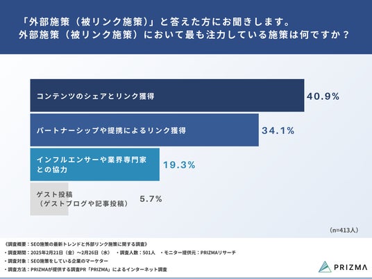 一方で「外部施策(被リンク施策)において最も注力している施策は何ですか?」と質問したところ、『コンテンツのシェアとリンク獲得(40.9%)』と回答した方が最も多く、『パートナーシップや提携によるリンク獲得(34.1%)』『インフルエンサーや業界専門家との協力(19.3%)』と続きました。