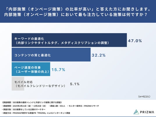 「内部施策(オンページ施策)において最も注力している施策は何ですか?」と質問したところ、『キーワードの最適化(47.0%)』と回答した方が最も多く、『コンテンツの質と最適化(32.2%)』『ページ速度の改善(15.7%)』と続きました。