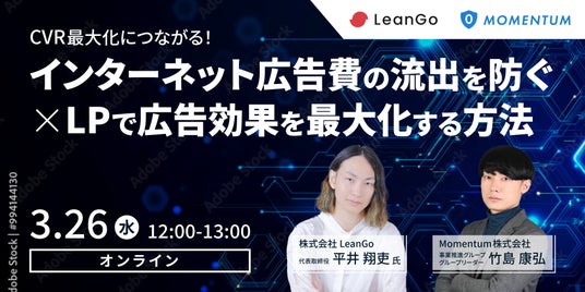 株式会社LeanGo(本社:東京都目黒区、代表取締役:平井 翔吏、以下 弊社)は、Momentum株式会社(本社:東京都港区、代表取締役:細井康平)と『インターネット広告費の流出を防ぐ×LPで広告効果を最大化する方法』無料ウェビナーを3/26に開催することをお知らせします。