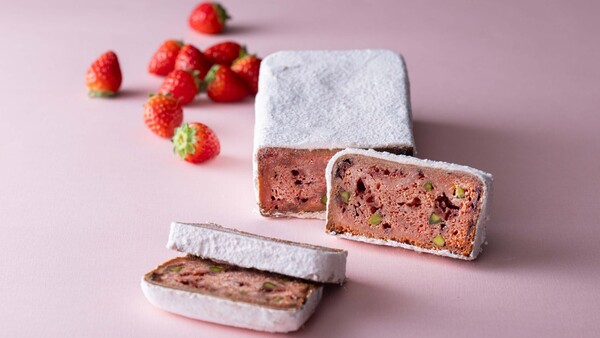 クリスマスの伝統菓子「シュトーレン」の技法を用い創り上げた「プランタン ~苺のお菓子~」は苺味のチョコレートやフリーズドライの苺などを使用。春らしいピンク色の生地に食感、味わいのアクセントとして、鮮やかな緑のピスタチオを散りばめています。