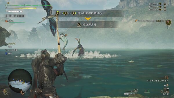 大物(大型魚)の場合はさらに駆け引きが加わり、左スティックを魚の動きに合わせて動かして疲れさせたり、ぐるぐる回して糸を巻き上げていく必要がある。