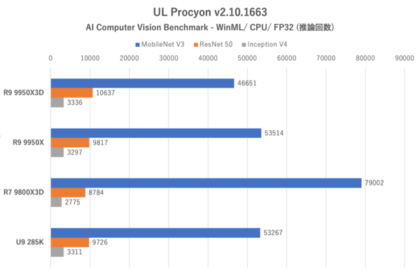 まず総合スコアーではRyzen 9 9950X3Dと9950Xは非常に僅差である。6つのテストそれぞれにおけるスコアーを見ると、Ryzen 9 9950X3Dは特別得意(=3D V-Cacheが効いている)と思われるものはなく、テストによってはRyzen 9 9950Xに負けているものもある(MobileNet V3の評価はブレやすいことが経験上わかっている)。全体としてはRyzen 9 9950X3Dが9950Xに勝っているテストが多く、総合スコアーでRyzen 9 9950X3Dがトップに立った、という感じだ。