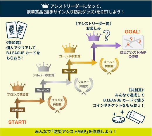 ・リワード詳細:各ミッションをクリアすると、個人に「参加賞」、達成人数に応じて「共創賞」とプレゼントが授与されます。さらに、気付きコメントへのいいね!獲得数と専門家評価により個人に「アシストリーダー賞」と選手サイン入り防災グッズのプレゼントが授与されます。