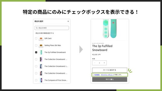Shopifyアプリである「シンプル利用規約チェックボックス|商品・カートページで使える」を使うと、特定の商品にのみチェックボックスを表示できます。