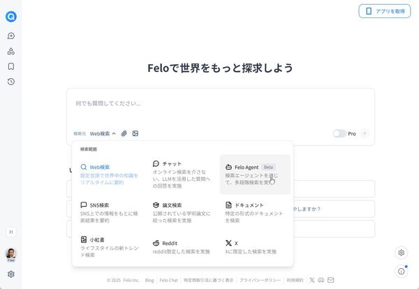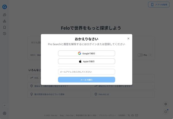 「Felo」は有料プランもあるが、無料でも利用できる。アカウントなしでも利用できるものの、機能が限定されるので、アカウントを登録しよう。メールアドレスで登録してもいいし、GoogleやAppleのソーシャルログインも利用できる。