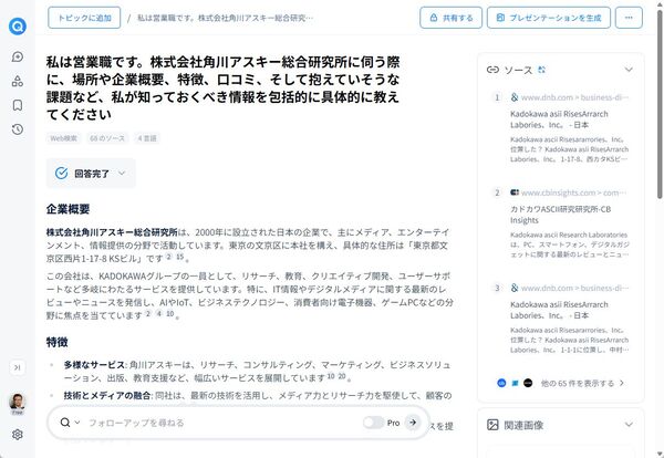 例えば、今回は角川アスキー総合研究所について営業職として知っておきたい情報を教えてもらった。あっという間に68ものソースを確認し、本社住所から概要、特徴などをレポートしてくれた。