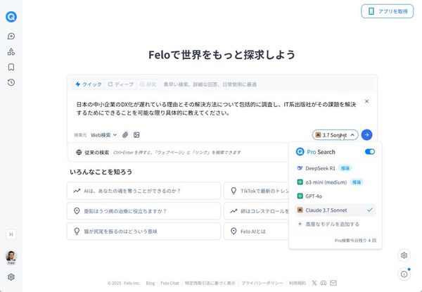 ChatGPTにも検索機能はあるのだが、やはり企業や業界を検索するならリアルタイム検索に強い「Felo」や「Perplexity」といった専門サービスの方が使いやすいのだ。