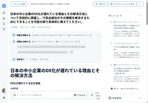今回は、中小企業のDXが遅れている課題に対し、メディアが解決するためのヒントを考えてもらった。8個のサブクエリで58のソースを調査して、2161文字の回答が生成された。