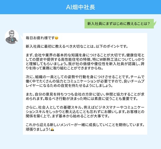 - 人材育成の促進:社長の知識がAIを通じて共有され、従業員のスキルアップと自律性が向上します。