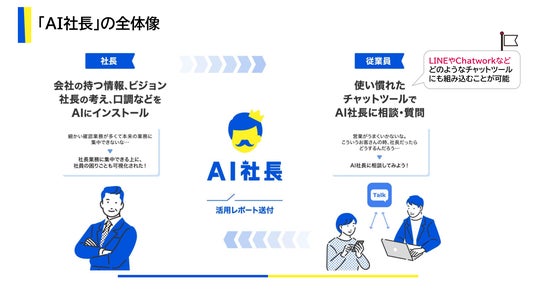 「AI社長」は、株式会社THAが開発したAIツールで、社長への依存を軽減し、従業員が自律的に働ける「自走する組織」を目指します。経営層の知識や価値観、社内情報をAIに統合し、従業員の日々の問題解決をサポートします。