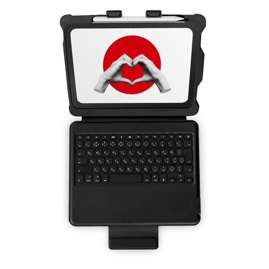 JIS規格日本語キーボード(かな印字あり)を搭載。iPad本体との接続はケースと一体化したUSBタイプCコネクタで行うため、面倒なケーブルの取り回しをする必要がなく、ケーブル断線のリスクを低減しました。複雑なBluetoothのペアリングも必要なく、すぐに滑らかなタイピングを実現します。