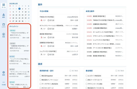 案件の情報やシフトについての情報を「誰が・いつ・何の情報を編集したか」をタイムライン機能にリアルタイムで表示されます。
