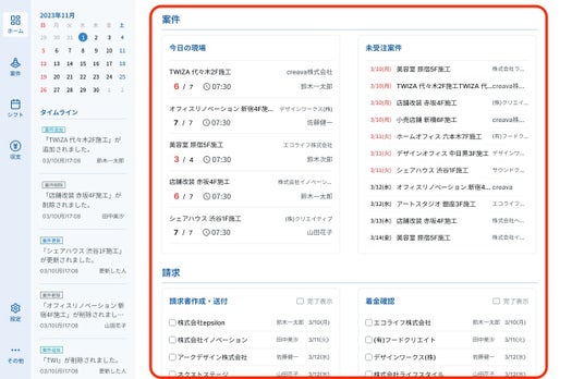 発注書未回収の案件先への連絡やまだ担当者が決まっていない現場への担当者調整など、「その日行わなくてはいけない事務作業」についての情報をダッシュボード機能で管理し、仕事の抜け漏れを防止します。
