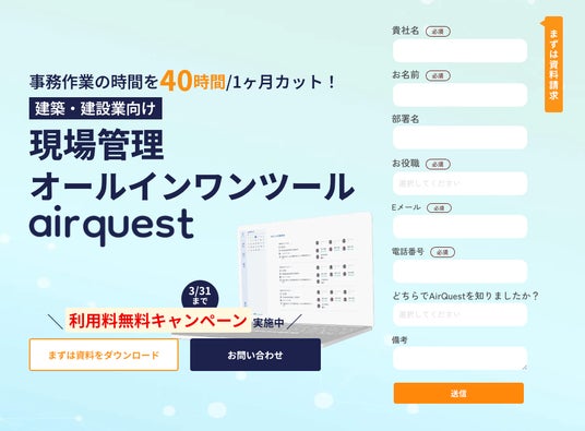 【事務作業を月40時間カット!】現場管理オールインワンツール《AirQuest》LP公開のお知らせ