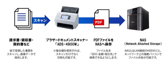メルコホールディングス(東・名 6676)グループの株式会社バッファロー(本社:愛知県名古屋市、代表取締役社長:牧 寛之、以下バッファロー)は、法人向けNAS「TeraStationシリーズ」と、ブラザー販売株式会社(本社:愛知県名古屋市、代表取締役社長:安井 宏一、以下ブラザー販売)が販売しているドキュメントスキャナーとレーザー複合機、インクジェットプリンターとの相互動作検証を行いました。両商品を組み合わせることで、紙で受領した請求書などの書類をスキャンし、PC操作なしで直接、ネットワーク上の複数の端末でファイルが共有できるNASに電子データで保存できるようになります。