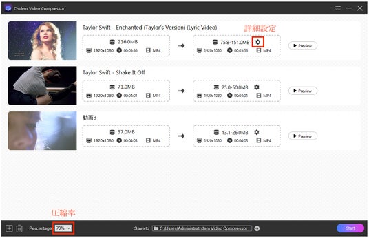 ステップ4. 左下の「Percentage」で簡単に圧縮率を選択できます。より多くの設定をしたい場合、サムネイルの右側の歯車アイコンをクリックして出力ファイルの品質、ビットレート、フォーマットなどを選択できます。