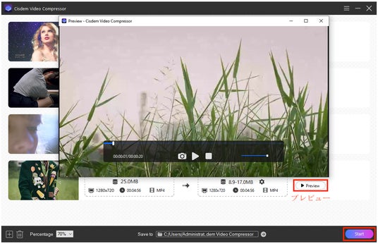 ステップ5. 設定完了後、プレビューボタンで出力ファイルを確認してから、右下隅の「Start」ボタンをクリックしてすべての動画ファイルを一括圧縮します。