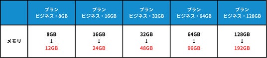 メモリ容量を無料で1.5倍に増設できる機能です。対応プランと拡張前後のメモリ容量は以下の通りです。