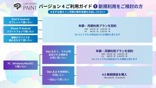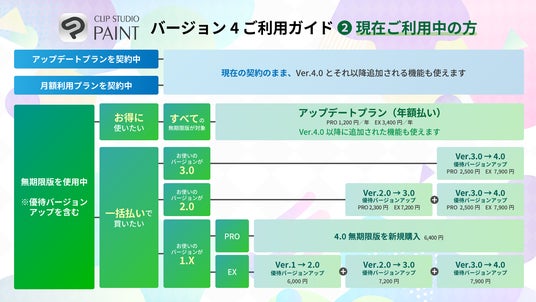 CLIP STUDIO PAINTの現在のご利用状況に応じて、Ver.4.0をご利用いただける方法は異なります。
