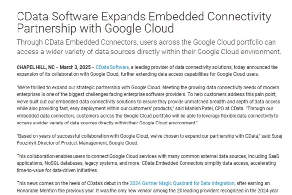 米CData Software(CData)は、2025年3月3日(米国時間)、Google Cloudとの業務提携の拡大を発表した。提携拡大により、Google Cloudが提供するデータアクセス機能が拡張される。