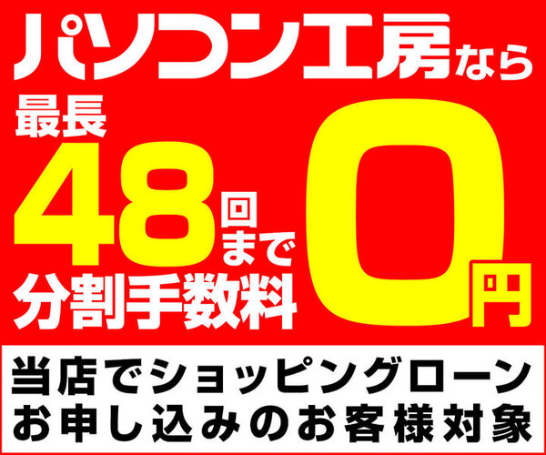 加えて、三井住友カード ショッピングクレジットを利用すれば、最長48回までの支払い手数料をパソコン工房が負担してくれる。一括で購入するのは厳しいけど、すぐにパソコンがほしいという人は、こちらの利用も検討してみるといいだろう。