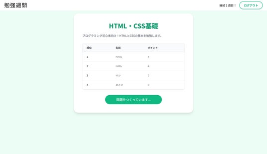 「勉強週間」は、同じ分野を学習している人同士が週に1度、小テストのスコアをランキング形式で競い合う学習サービスです。小テストは生成AIにより自動作成され、テストを開始するたびに毎回異なる問題が10問出題されるため、常に新鮮な気持ちで挑戦できます。