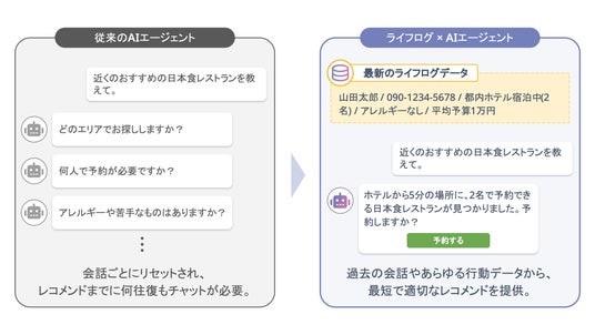 従来のAIエージェントは、毎回同じ情報を入力しなければならない、パーソナライズが弱いといった課題がありました。本サービスは、ユーザー自身が過去の行動データを活用できる環境を整えることで、AIエージェントがより直感的かつ効率的にサポートできるようになります。