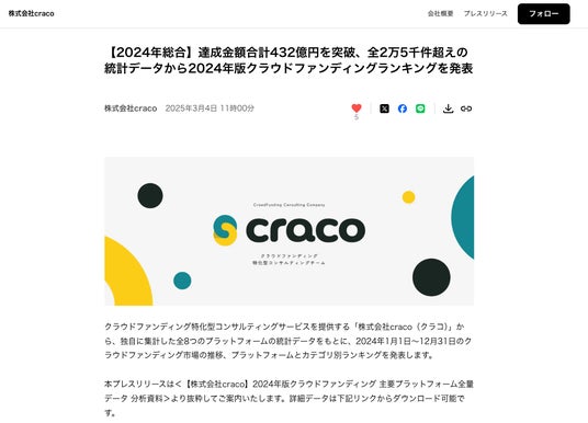 【株式会社craco】独自のクラウドファンディング分析データ、7万件を突破