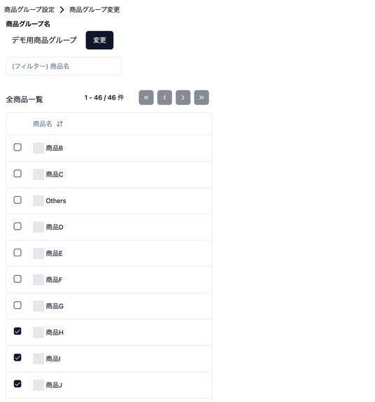 商品グループ機能商品を任意の単位でグルーピングし、売上を集計する機能。例えば、今期の注力商品グループや、自社独自の商品カテゴリー、担当チーム別の商品グループなど自由に設定可能。