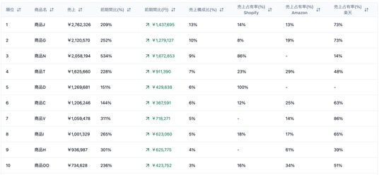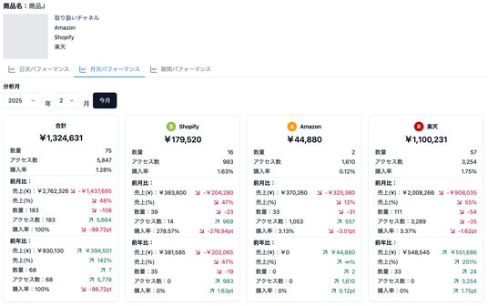 商品別分析全ての商品に対して、個別のレポートを用意。各チャネルでの売上、販売数量、商品ページへのアクセス数、購入率(コンバージョンレート)といった主要KPIを表示。全てのKPIに対して、デフォルトで前月比・前年比を表示させ、売上の変動要因を明らかにします。