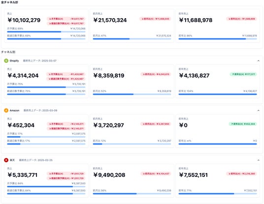 ダッシュボード1.CROSS ANALYTICSのトップページ(ダッシュボード)には、全チャネル合計および各チャネルの売上を前月比、前年比とセットで表示。