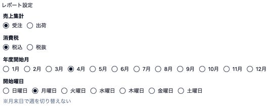 年度・曜日設定データ集計の手間を極小化させることを目的に、年度の開始月や週の開始曜日、あるいは税込・税別など、企業によって異なる集計方法を任意で設定することを可能にしました。
