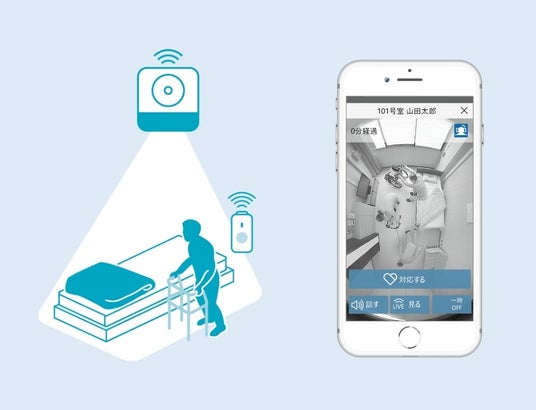 - 映像で状態を確認し、入居者様の安全と安心入居者様の注意行動があった際に、手元のスマートフォンで居室内での様子が映像で分かるため、効率的な駆け付けや転倒事故の防止をご支援します。また、転倒事故発生時や状態に変化があった際の家族説明等を、明確に行えます。