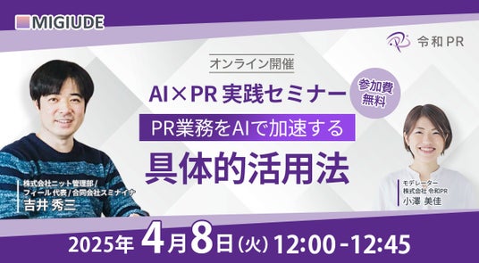 「経営をPRで加速させる」をビジョンに掲げ、多様な業界のPR支援を行う株式会社令和PR(本社:東京都新宿区、代表取締役:小澤美佳)は、4月8日(火)に「AI×PR実践セミナー ― PR業務をAIで加速する具体的活用法」をオンラインにて開催します。本セミナーでは、PR業務でAI活用の実践者である株式会社ニットの吉井秀三氏を講師に迎え、生成AIを活用して広報・PR業務の生産性を向上させる手法について紹介します。