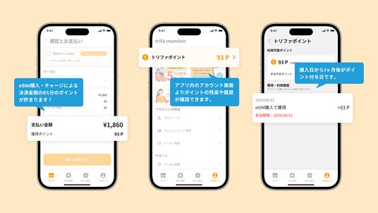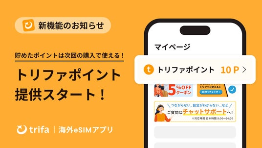株式会社トリファ(本社:東京都品川区、代表取締役:嘉名 雅俊)は、海外渡航者向けeSIM通信サービス「トリファ」において、新機能「トリファポイント」をリリースしました。